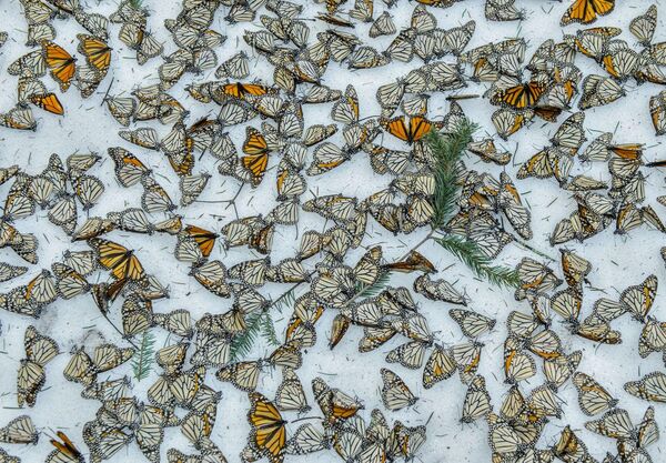 Doğa, Üçüncülük Ödülü: 8 - 9 Mart 2016 tarihleri arasında şiddetli kar fırtınası sonrası Monarch kelebekler karın üstünü örtüyor.