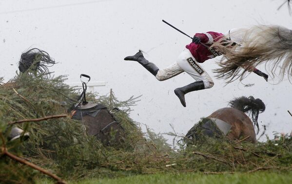 Spor, Birincilik Ödülü: Jokey Nina Carberry, 9 Nisan'da Büyük Ulusal yürüyüş yarışında atla beraber çitten yuvarlanıyor. 2016, Liverpool, İngiltere