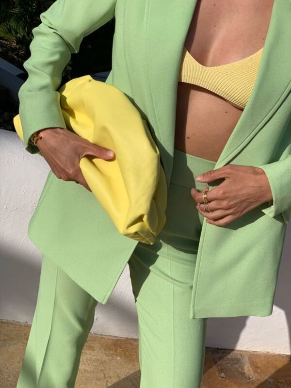 Yine monokrom stilde bir takıma akşam yemeklerinde daha da renk katmak isteyebilirsiniz. Yeşile en güzel yakışacak renklerden biri de sarı olsa gerek...