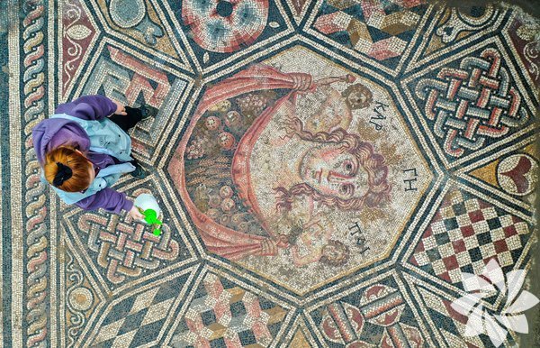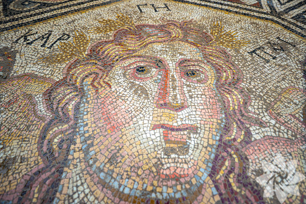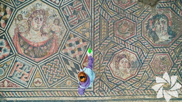 Merkezdeki bölümün etrafındaki saç örgüsü motiflerinin her rengin 3-4 farklı tonu kullanılarak yapıldığını, geometrik ve üç boyutlu motiflerle bezendiğini, labirent, gordion düğümü gibi motifler yapıldığını anlatan Kahveci, "Mozaikte 'tessera' dediğimiz yapı taşları, taş, mermer ve camdan temin ediliyor. Dış hatlarda bir, merkez tasvirlerde yarım santimetreküp. Oldukça detaylı bir çalışma yapılmış." dedi.