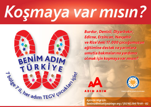 16 Kasım 2014’te koşulacak İstanbul Maratonu ve 1 Mart 2015’teki Runtalya Maratonu’na katılacak olan Adım Adım koşucuları, “Benim Adım Türkiye” projesine bağış yaparak destek vermek isteyenlere çağrıda bulunacak. Projenin hedefi Edirne, Rize, Erzincan, Burdur, Denizli, Nevşehir ve Diyarbakır’daki TEGV öğrenim birimlerinin 2 yıllık işletme giderleri karşılanarak ilköğretim çağındaki toplam 17 bin çocuğa eğitim desteği sağlanması. Böylece, TEGV’in 20. yaşını kutlayacağı 2015 senesinde Türkiye’nin 7 coğrafi bölgesine de eğitim alanında aynı kalıcı desteğin verilmesi amaçlanıyor.