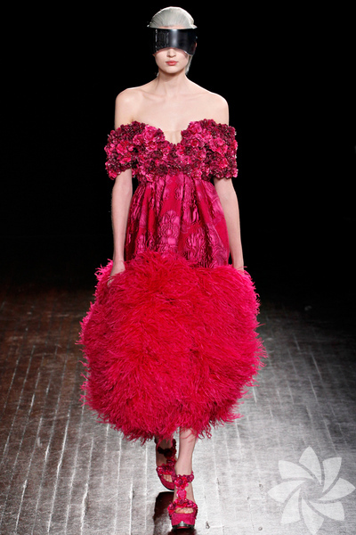 2012-2013 Alexander McQueen Sonbahar / Kış koleksiyonunun en ilgi çekici materyalleri arasında kürkler, deve kuşu tüyleri, metal kemerler sayılabilir.