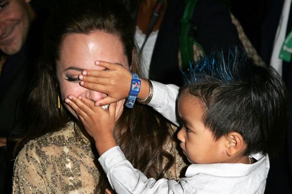 2004 yılında evlatlık oğlu Maddox'la birlikte oyun oynarken.
