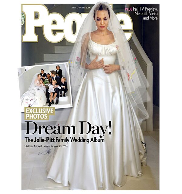 Jolie'nin gelinliği Versace modaevinden Luigi Massi tarafından tasarlandı. Angelina Jolie'nin duvağında ise altı çocuğunun çizimleri yer alıyor.