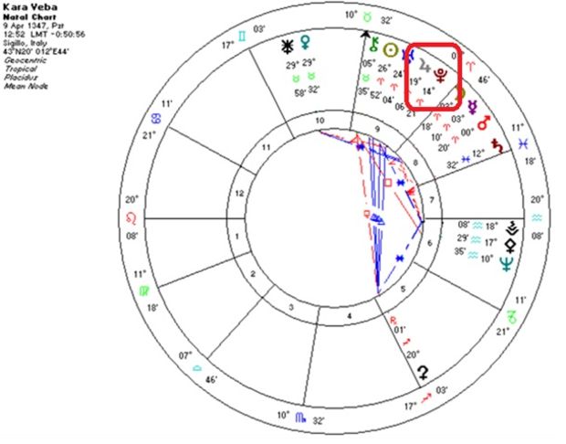 Kara veba 1347 yılında Sicilya’da ortaya çıkmış ve neredeyse Avrupa’nın üçte birini öldürmüş çok büyük bir felaketti. Bu haritada en çok dikkat çeken haritanın 9. Evi’nde gördüğümüz Koç burcundaki gezegen toplaşması ve Jüpiter ile Pluto kavuşumunun henüz başlıyor olması.