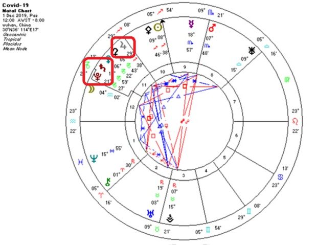 Koronavirüs’ü incelemeye başlayalım. Yukarıda Wuhan’daki ilk vakanın ilan anını görüyorsunuz. Henüz dünya çapında bir pandemi değil ve Jüpiter tıpkı İspanyol giribindeki gibi Oğlak burcuna girmeye ve Pluto ile kavuşuma hazırlanıyor.