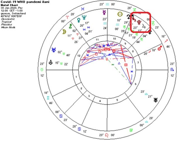 Yukarıdaki harita ise Dünya Sağlık Örgütü’nün pandemiyi resmi olarak ilan ettiği tarih... Ve sahne Jüpiter Pluto kavuşumunun! Kavuşuma Satürn de dâhil oldu ve kavuşum iş hayatı, finans ve kurumlarla alakalı olan Oğlak burcu’nda gerçekleşti. Satürn ciddi kısıtlamalar ve kuralları da beraberinde getirdi ve birçok ülke pandemi ile ilgili sıkı yasaklar ilan etti.