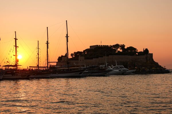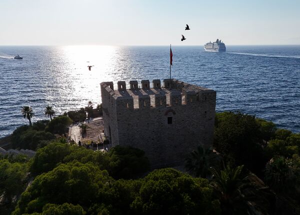 Egenin önemli turizm merkezlerinden Aydın'ın Kuşadası ilçesinde, limana yakın konumda bulunan Güvercinada Kalesi, limana yanaşan dev yolcu gemilerindeki turistleri karşılıyor.