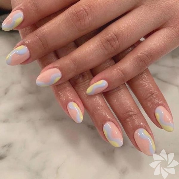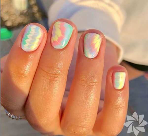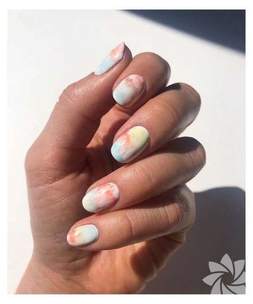 Kısa tırnaklarda mavi tonlu batik desendeki nail artlar oldukça güzel duruyor.