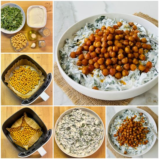 *Haşlanmış nohut, 2 yemek kaşığı zeytinyağı, baharatlar ve tuzu bir kasede karıştırıp 180 derece ısıya ayarlanmış airfriyer veya fırında 20 - 25 dakika kızartın ve ılınması için bir tabağa geçirin.