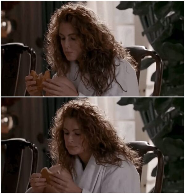 'Özel Bir Kadın' filminde bir sahnede kruvasan yiyen Julia Roberts, diğer sahnede pankek yediğini görebilirsiniz.