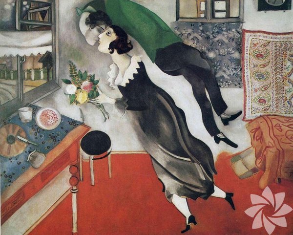 Eserlerinin genelinde aşkı büyük bir ilham kaynağı olarak kullanan ressam bu tablosunu kendi evliliğinden biraz önce çiziyor ve eşiyle paylaştığı şaşırtıcı, akıcı ve güçlü aşkın harika bir şekilde ifade ediyor. Chagall, kendinizi sevgili eşinin üzerinde süzülen akıcı ve rüya gibi resmediyor ve karısını öpmek için dönerken gerçek dünyanın bütün kurallarına meydan okuyor.