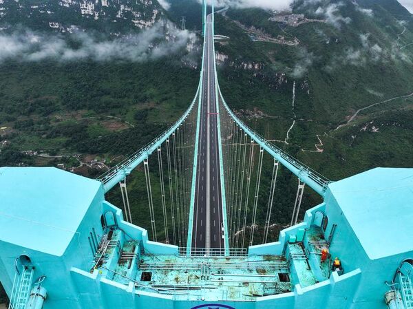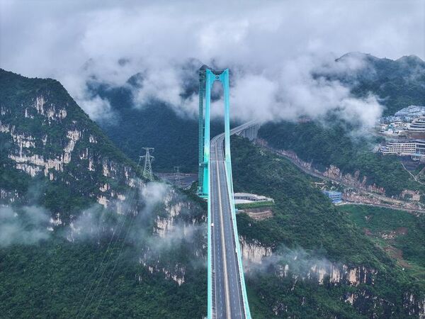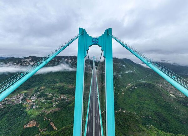 Guizhou eyalet yetkililerine göre, ana açıklığı bin 420 metre olan köprü, dağlık arazide inşa edilen dünyanın en uzun açıklıklı çelik kafes kirişli asma köprüsü oldu.
