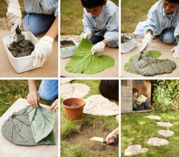 Büyük yapraklar yardımı ile çimentodan üzerinden atlama taşları yapabilirsiniz.