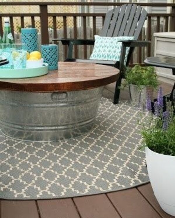 Bahçenizdeki sehpanızı eski bir kovadan yaparak mum ve yastık gibi yağmurda dışarı bırakmak istemediğiniz şeyler için bir depolama alanı oluşturabilirsiniz.