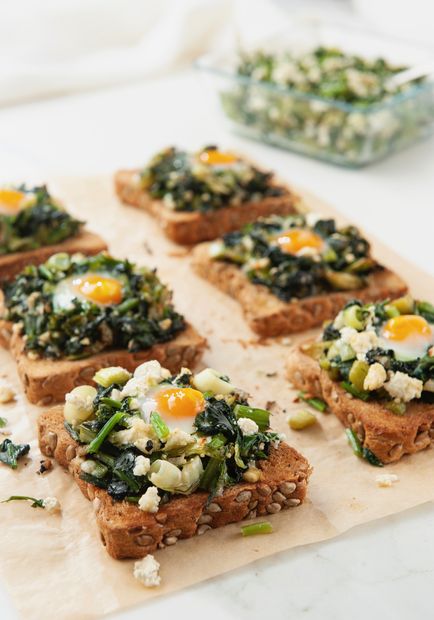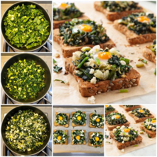 *Ekmekleri tost makinesinde kızartarak sotelenmiş yeşillikleri üzerlerine eşit oranda pay edin. En üstlerine birer yumurta kırın. 200 derecede önceden ısıtılmış fırında yumurtaların beyazları pişene kadar yaklaşık 10 dakika fırınlayın.