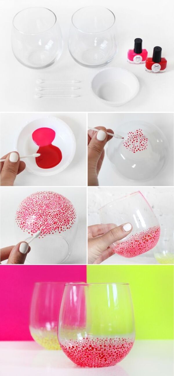 Bardaklarınızı süslemekte çürüyen ojelerinizi kullanmaya ne dersiniz. Biraz su, birkaç renkte oje ve eskiyen cam bardağınız...