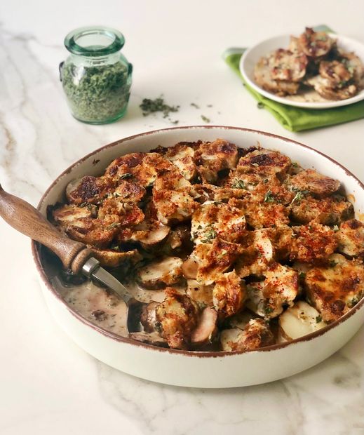 *Krema, parmesan, mozarella, kekik, karabiber, muskat, sarımsak ve tuzu bir kaba alarak karıştırın. Karışımı yer elmalarının üzerine yayın. Üzerine kırıntılanmış ekmekler, zeytinyağı ve dilerseniz az miktarda pul biber serpiştirip önce fırın kağıdı, sonra folyo ile kaplayın.