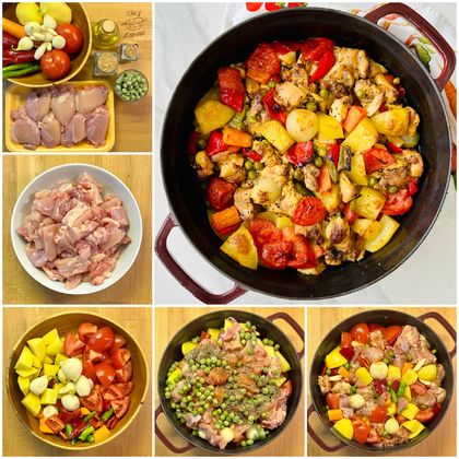 • Sebzelerin hepsini geniş bir döküm tencereye veya fırın kabına aktarın, kuşbaşı doğranmış tavuk etleri, bezelye, zeytinyağı, baharatlar ve tuzu ilave ederek iyice harmanlayın. Tencerenin kapağını kapatın (fırın kabında yapacaksanız üzerini pişirme kağıdı ve folyo ile kaplayın).
