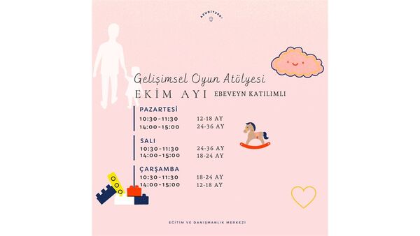 Uzman gelişim psikoloğu ile birlikte gerçekleşecek olan Ebeveyn Katılımlı Gelişimsel Oyun Grubu, 12-36 aylık çocuklar ve ebeveynleri içindir. 10 Ekim'deki etkinlikle ilgili detaylı bilgi almak ve katılmak için Biletino websitesini ziyaret edebilirsiniz.