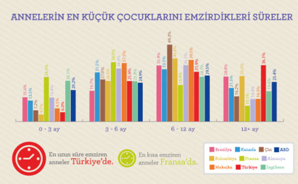 Tüm dünyada anneler emzirmiş olsalar da olmasalar da bir bebeği beslemenin en doğru yolunun emzirmek olduğunu düşünüyorlar. Bunun yanı sıra anneler her zaman emzirme süresi konusunda belirledikleri hedeflerine ulaşamayabiliyorlar. Annelerin %75’e yakını bebeklerin en az 6 ay ve üzerinde emzirilmesi gerektiğini düşünürken, gerçekte sadece %62’si bu kadar süre emzirebiliyor. Türkiye’de ise emzirme süreleri birçok ülkenin oldukça üzerinde. Türkiye’deki annelerinin %82’si bebeklerin ideal olarak 6 ay ve üzerinde emzirilmesi gerektiğini düşünüyor. Bunun gerçekleştirebilen annelerin oranı ise %68. 6-12 ay arasında emzirebilen annelerin oranı %32, 12-24 ay arasında emzirebilen annelerin oranı %31, %5 ise 2 yıldan fazla bebeğini emzirdiğini belirtiyor. Örneğin Fransa’da bebeğini bir yıldan fazla emzirebilen annelerin oranı sadece %10.