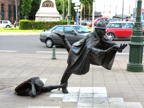 1985 yılında Brussels'da yapılan heykel, Belçikalı heykeltraş Tom Frantzen'ın eseri espirili bir dile sahip. Polis memurunu rögar kapağını açıp yere düşüren bir insan tasvir ediliyor.