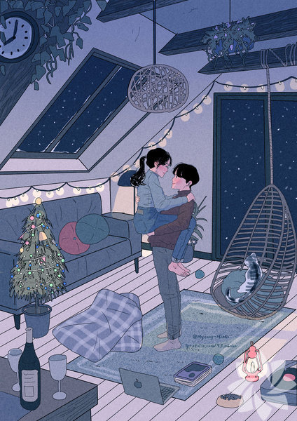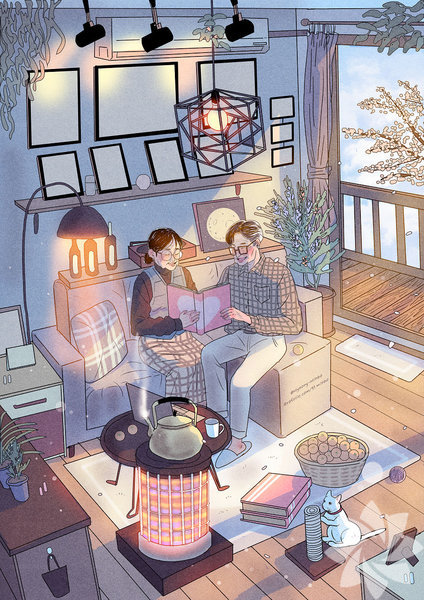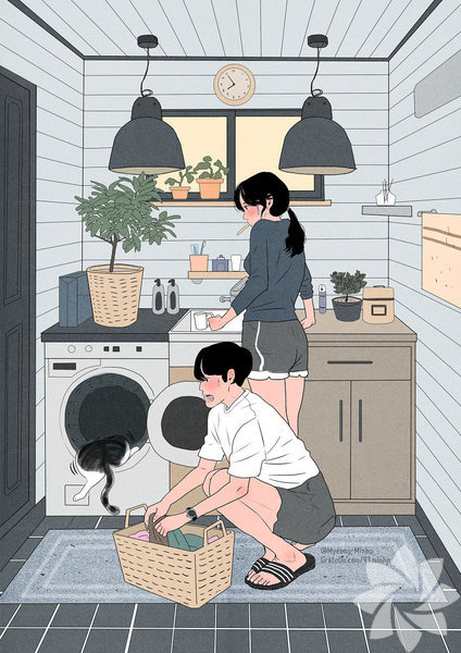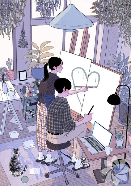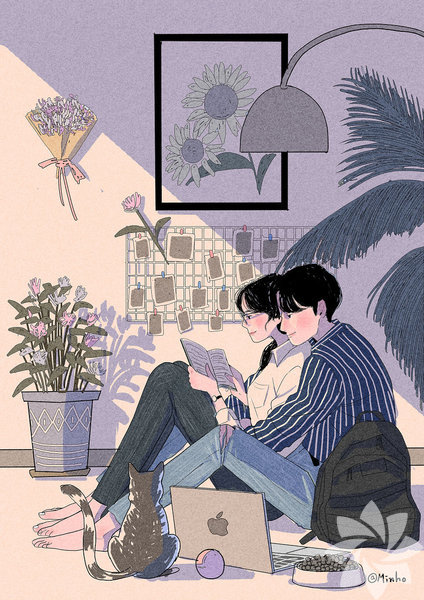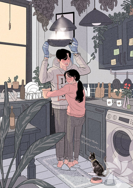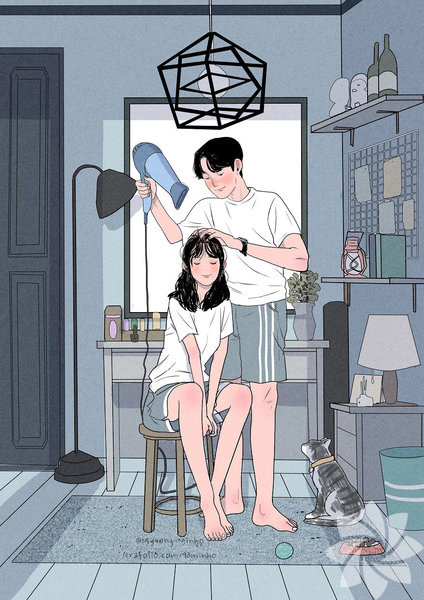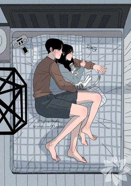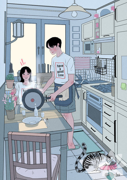 Koreli sanatçı Myeong-Minho, bir çiftin günlük yaşamını en içten haliyle resmediyor. Birlikte yemek yapmaktan dişlerini fırçalamaya, çiçekleri sulamaktan seyahat etmeye kadar aşkın en doğal hallerini yansıtan sanatçı, illüstrasyonlarında en çok minik kedinin dikkat çektiğini söylüyor. İşte aşkın en doğal halleri...