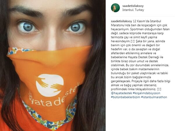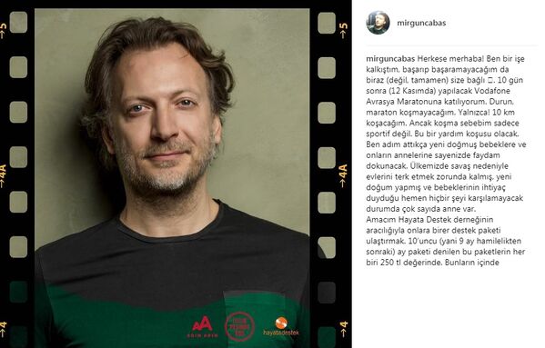 "Herkese merhaba! Ben bir işe kalkıştım, başarıp başaramayacağım da biraz (değil, tamamen) size bağlı. 10 gün sonra (12 Kasımda) yapılacak Vodafone Avrasya Maratonuna katılıyorum. Durun, maraton koşmayacağım. Yalnızca! 10 km koşacağım. Ancak koşma sebebim sadece sportif değil. Bu bir yardım koşusu olacak. Ben adım attıkça yeni doğmuş bebeklere ve onların annelerine sayenizde faydam dokunacak. Ülkemizde savaş nedeniyle evlerini terk etmek zorunda kalmış, yeni doğum yapmış ve bebeklerinin ihtiyaç duyduğu hemen hiçbir şeyi karşılamayacak durumda çok sayıda anne var. Amacım Hayata Destek derneğinin aracılığıyla onlara birer destek paketi ulaştırmak. 10'uncu (yani 9 ay hamilelikten sonraki) ay paketi denilen bu paketlerin her biri 250 TL değerinde. Bunların içinde bebeklere gereken temel kıyafet ve bakım malzemeleri var. Ben 200 paket tutarında bağış toplayabileceğimi umdum ve 50 bin TL'lik bir hedef koydum. Eğer siz de yeni doğmuş bir bebeğin hayatta kalmasını kolaylaştırmak isterseniz kampanya sayfamdan bağış yapabilirsiniz. Sayfanın linki profilimde. Sizin için çok hızlı koşacağımdan emin olabilirsiniz. Teşekkür ederim."