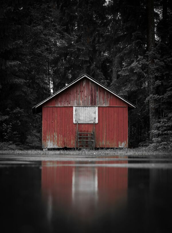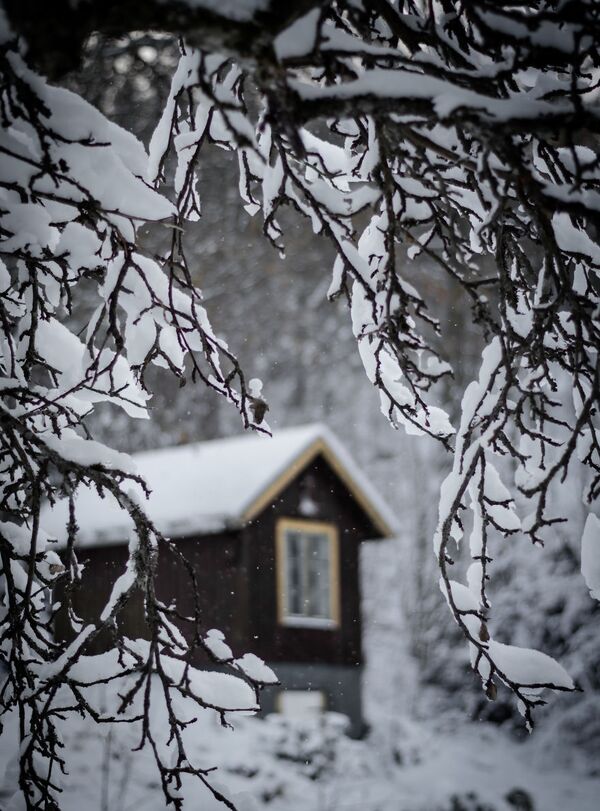 Karın ilk günü nehir boyunca yürüdüğüm zaman, ormanın içinde bu küçük kırmızı kulübeyi buldum. Neyse ki, güneş hemen arkamdaydı.