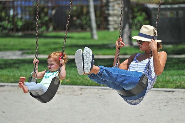 Kızıyla birlikte salıncağa binen ve uzun süre parkta vakit geçiren Alba, neşeli haliyle dikkat çekti.