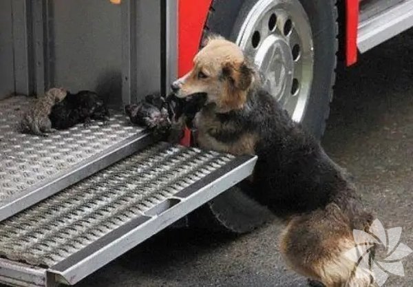 İtfaiyeciler evde çıkan yangınla uğraşırken kurtarma görevinde olan biri daha vardı. Yavrularını güvenli bir yere, itfaiye arabasına taşıyan anne köpek...