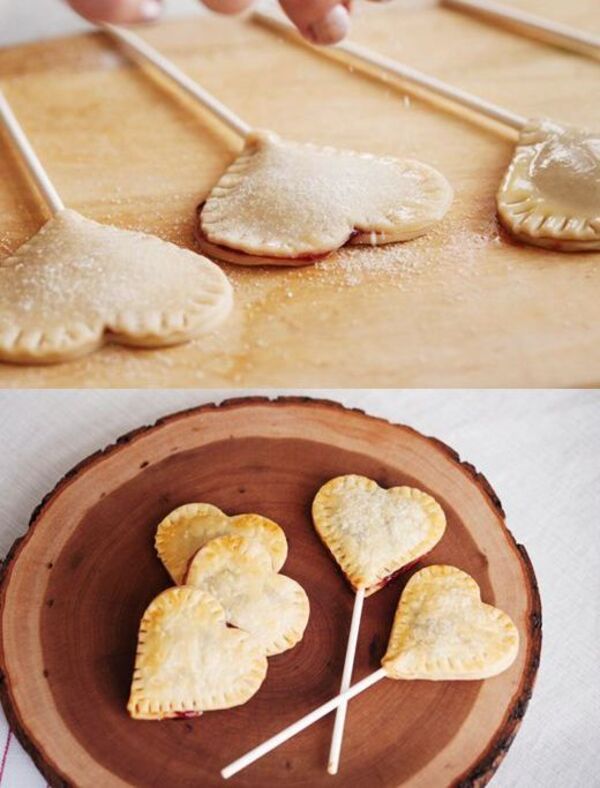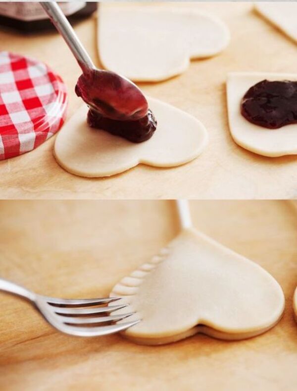 Ardından içine koyacağınız marmelatı kalbin tam ortasına yerleştin ve diğer kalple üstünü kapatın. Çatalla kenarlarına şekil verin. Dilerseniz ucundan tutabilmeniz için çubuk ekleyin. Üzerine yumurta sarısı sürdükten sonra biraz toz şeker dökün.