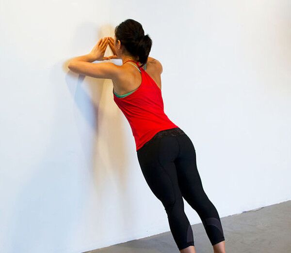 Yüzünüzü duvara dönün, ellerinizi duvara yaslayıp vücudunuzu, tüm gücünüzle 8-12 kez geriye itin.