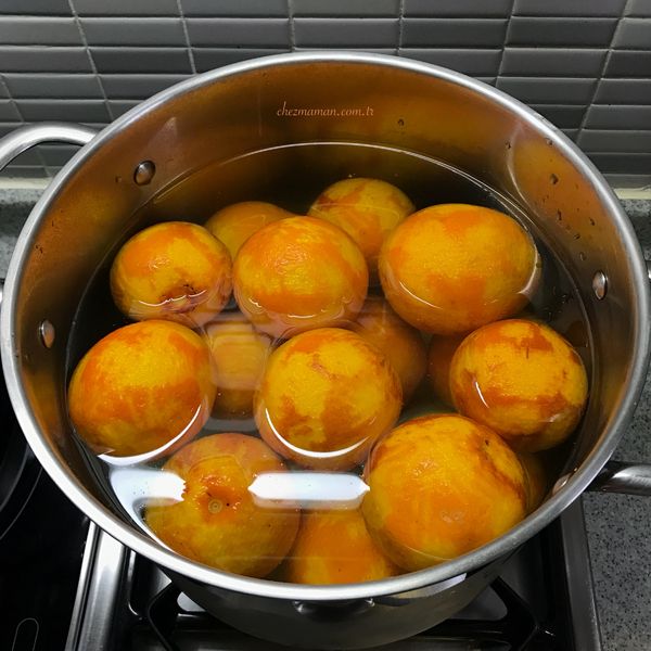 Bu süre sonunda portakalları soğuk suya alın, ara sıra suyunu değiştirerek bir gece bekletin (bu işlemi portakal kabuğunun acısını suya bırakması için yapıyoruz).