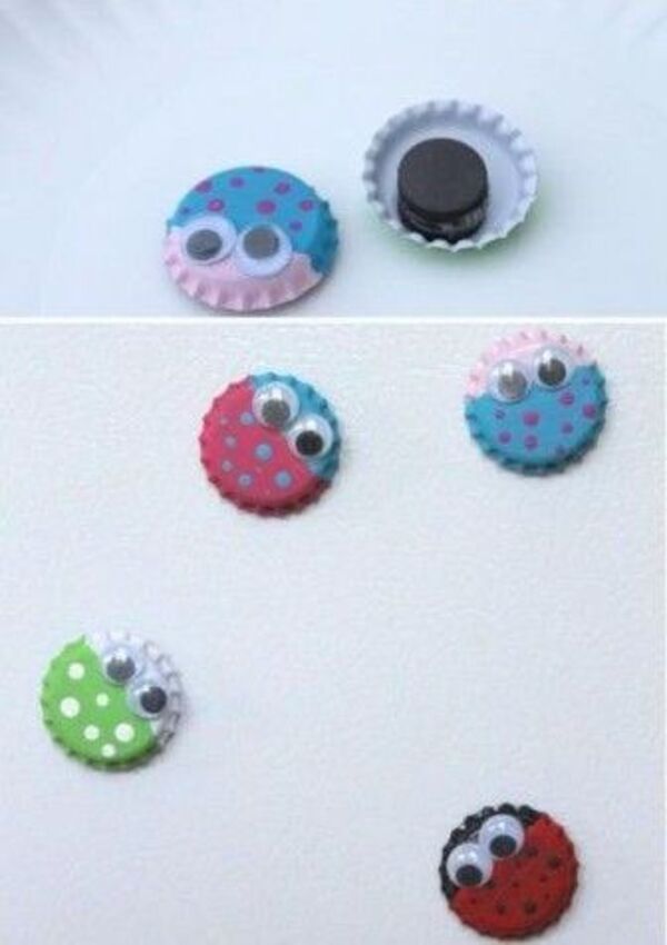 Herhangi bir tuhafiyede bulabileceğiniz oyuncak gözlerden satın alın ve üstüne yapıştırın. Gazoz kapaklarının iç kısmına da mıknatısını yapıştırın. İşte magnetiniz hazır...