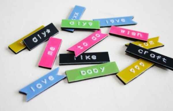 Kabartmalı plastik etiketlere istediğiniz kelimeleri, cümleleri, isimleri yazdırın. Arkalarına mıknatıs yapıştırarak renkli bir buzdolabı kapağı tasarlamış olursunuz.