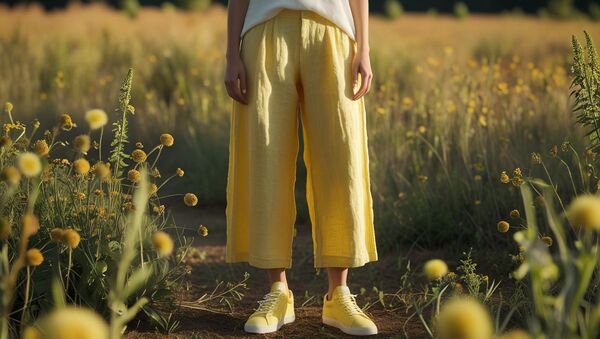 Tereyağı sarısı keten pantolon ve aynı renk ayakkabılar
