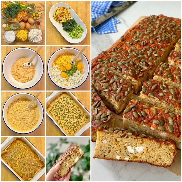 *Islanan mercimeği süzgeçten geçirin (ıslama suyundan yarım bardak ayırın). Süzülmüş mercimeği yarım bardak suyuyla birlikte püre haline gelene kadar blenderden geçirin ve büyük bir karıştırma kabına aktarın. Üzerine kabartma tozu, karbonat, baharatlar, tuz ve zeytinyağını ilave edip spatula yardımıyla karıştırın. Yoğurt, rendelenmiş peynir, lor, yumurtalar, taze soğan, dereotu ve zeytini ekleyip homojen kıvama gelene kadar karıştırın.
