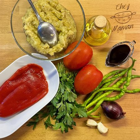 *Patlıcan ve biberleri közleyip temiz bir poşet içinde 10 dakika kadar bekletin (patlıcanlar ve biberin kabuklarının kolay soyulması için). Daha sonra kabuklarını soyarak kabaca doğrayın.