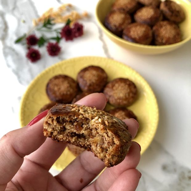 *Kuru üzüm, kayısı, dut kurusu, fındık içi ve keten tohumunu blenderden geçirin. Hindistan cevizi yağı, tahin, yulaf unu, rendelenmiş portakal kabuğu, bir tam yumurta, bir yumurta akı ve karbonatı blenderden geçirdiğiniz malzemelere ilave ederek elinizle yoğurun (ele yapışan bir hamur oluyor). Elinizi suyla ıslatıp hamuru kabuklu ceviz boyutunda parçalara ayırın, yuvarlayıp disk haline getirerek fırın kağıdı serilmiş tepsiye aralıklı olarak yerleştirin. Üzerlerine yumurta sarısı sürüp susam serpiştirin.