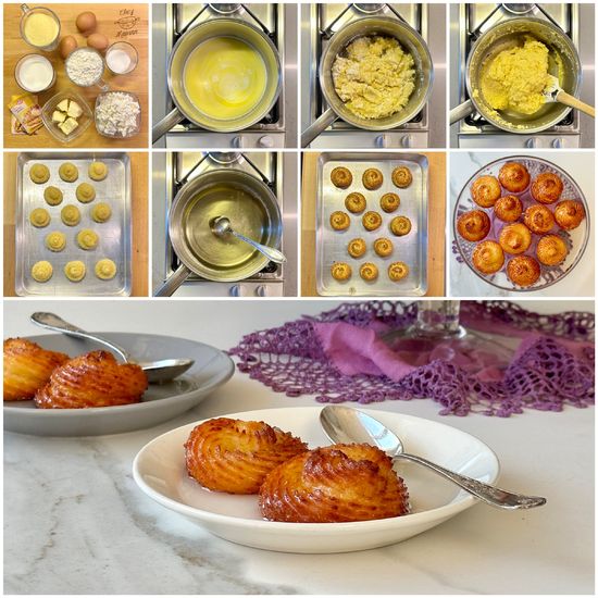 *Süt, tereyağı ve toz şekeri orta boy tencereye alın, orta ateşte kaynamaya başlayınca un ve irmiği ekleyip toparlanana kadar 4 - 5 dakika karıştırın (bu aşamada epey sert olan hamura lor peyniri ve yumurta ekleyince kek hamurundan biraz daha koyu kıvamlı bir hamur elde ediyoruz). Ocağı kapatıp lor peyniri, kabartma tozu ve vanilyayı ekleyip karıştırın. Hamur ılınınca 3 yumurtayı birer birer ekleyerek mikser ile çırpın (hamur çok koyu olursa 1 yumurta daha ilave edin). Sıkma poşetine yıldız gibi bir uç geçirip hamuru poşete aktarın, poşetin ucunu kesin.