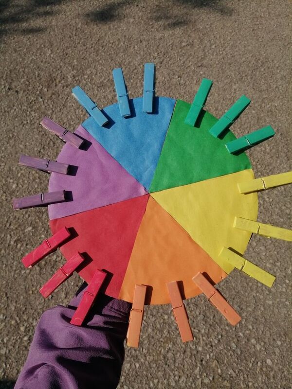 Farklı renklerde mandallar ve aynı renklerde kağıt ya da kumaş parçaları.