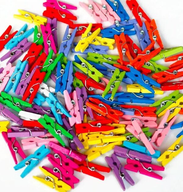 Farklı renklerde mandallar ve bir kutu ya da sepet.