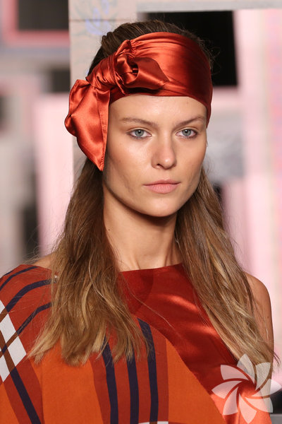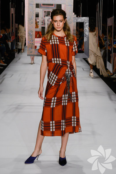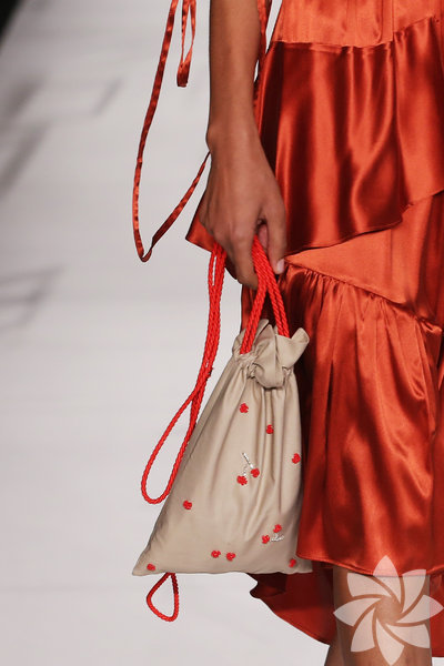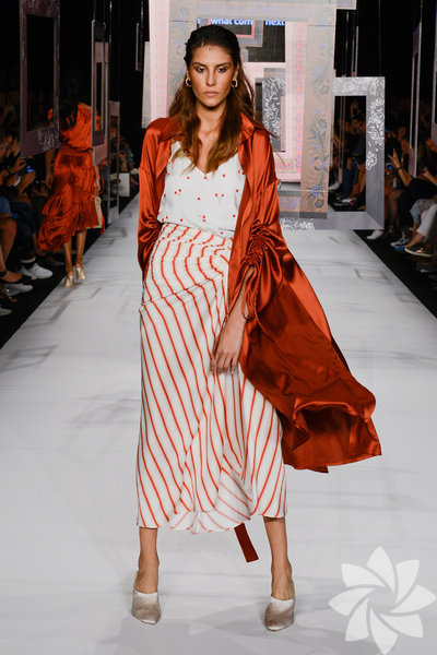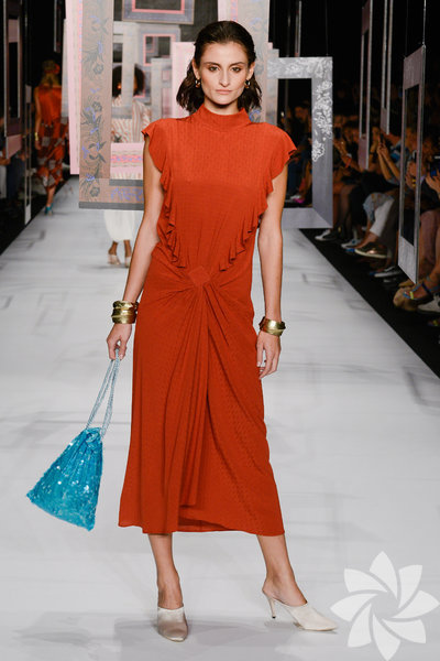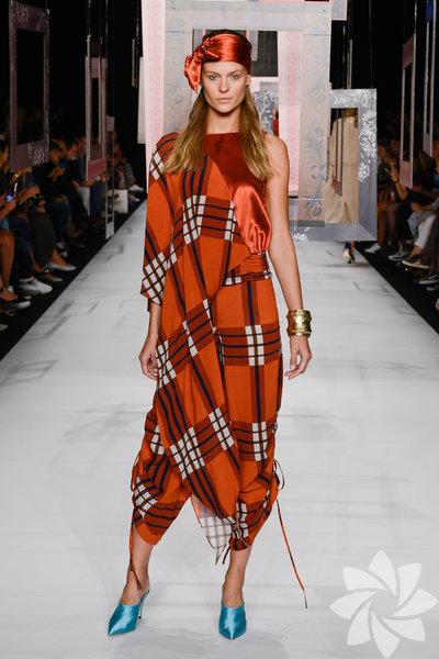Pötikare ve kırmızı çizgili kumaşlar, kiremit kırmızısı ipeklerle devam ederken günbatımının büyüsü koleksiyonu kaplamaya başlıyor. 8 / 50