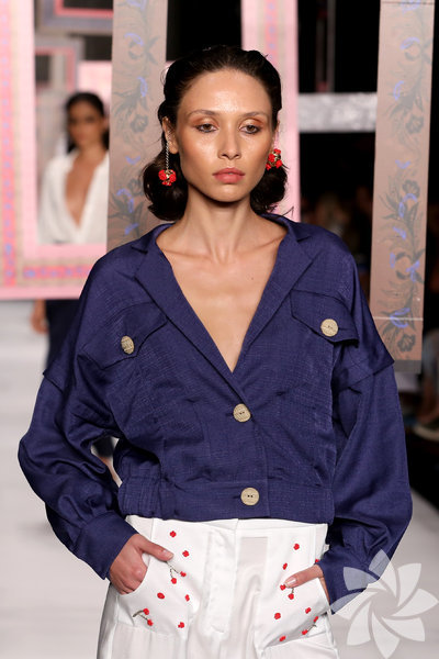 Mehtap Elaidi tasarım ekibi tarafından tasarlanan özel nakış desenleri ve işlemeler kumaşlarda, manşetlerde ve yakalarda masalsı bir görünüm yaratırken, gömleklerle ceketlerdeki maskülen ve rahat formlar zıtlık oluşturuyor. 6 / 50