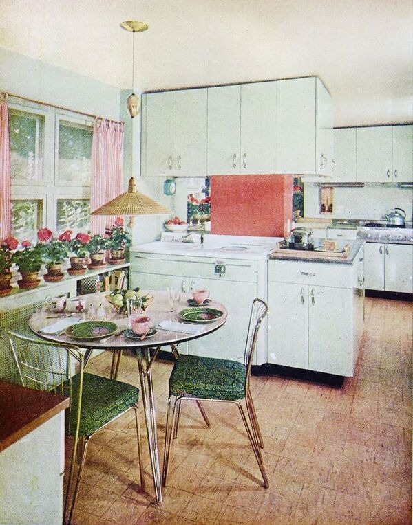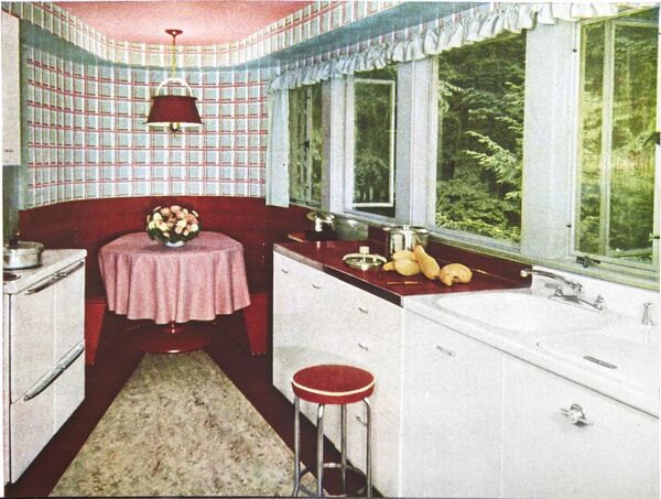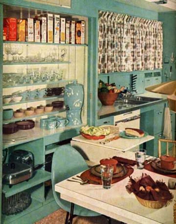 Açık mutfaklar günümüz modasına daha uygunmuş gibi gelse de 1950'lerinin modern evlerinde birçok işi aynı yerde görmek için kullanılmaktaydılar. Dolaplarla yemek yeme alanıyla pişirme kısmı birbirinden ayrılıyordu.