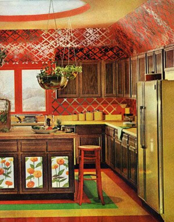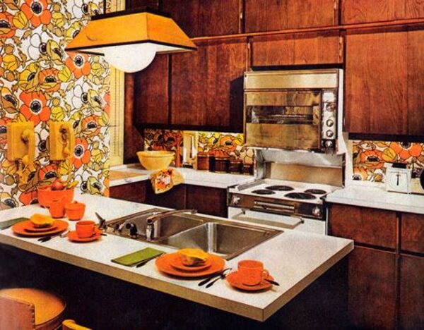 60'ların cüretkar dekorasyonları 70'lerde daha deneysel bir hal almaya başlamıştı. Renli ve desenli duvar kağıtları ve ahşap dolaplar sıklıkla tercih ediliyordu.