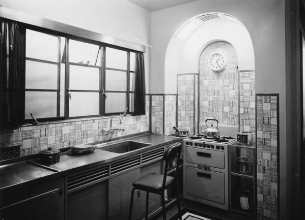 Art Deco döneminin parlak ve göz alıcı çizgileri mutfakta da yer bulmuştu. Mutfağın ışık almasına önem veriliyordu ve fotoğraftaki gibi üçlü pencereler sıkça kullanılıyordu. Parlak çizgiler ve geometrik motifler de kesin hatlar belirliyordu.