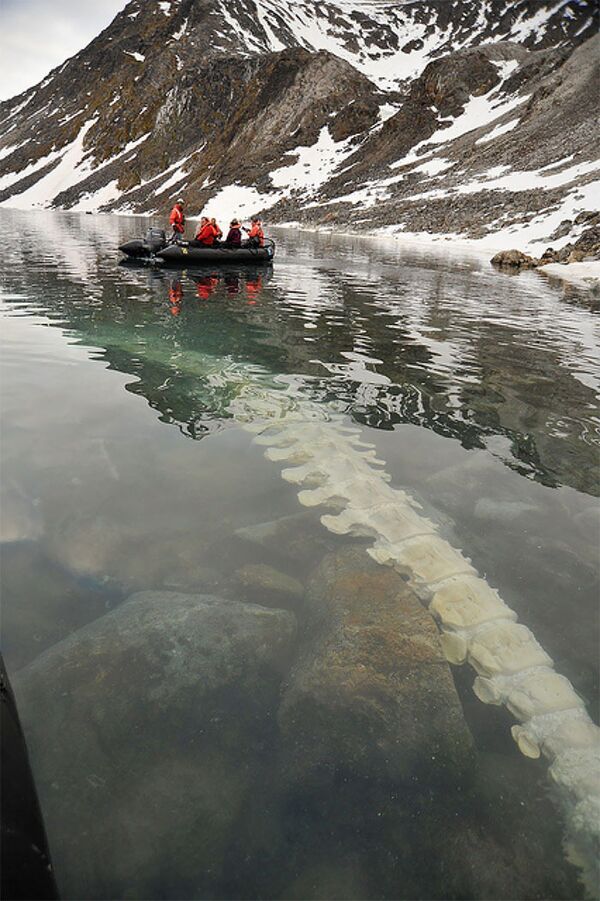 Kongsfjorden, Norveç yakınındaki suyun altında yüzen Balina Vertebra'nın omurgası