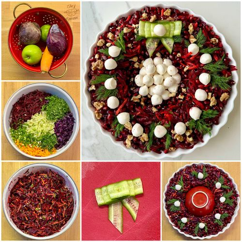 Yılbaşı sofralarında göze de hitap eden narlı, havuçlu, mor lahanalı, elmalı ve pancarlı leziz salata. Tam bir kış salatası olan nefis lezzeti yılbaşı haricinde de hazırlayarak buzdolabında yaklaşık bir hafta saklayabilirsiniz...
